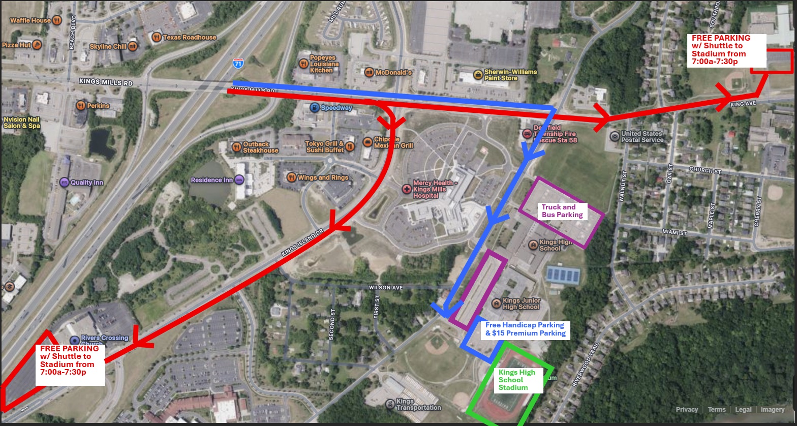 There is free parking at Rivers Crossing Community Church (5937 Kings Island Dr, Mason, OH 45040). Shuttle bus service begins running at TBA and will be available to the stadium at no charge.
